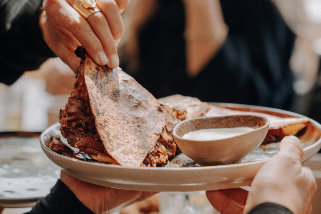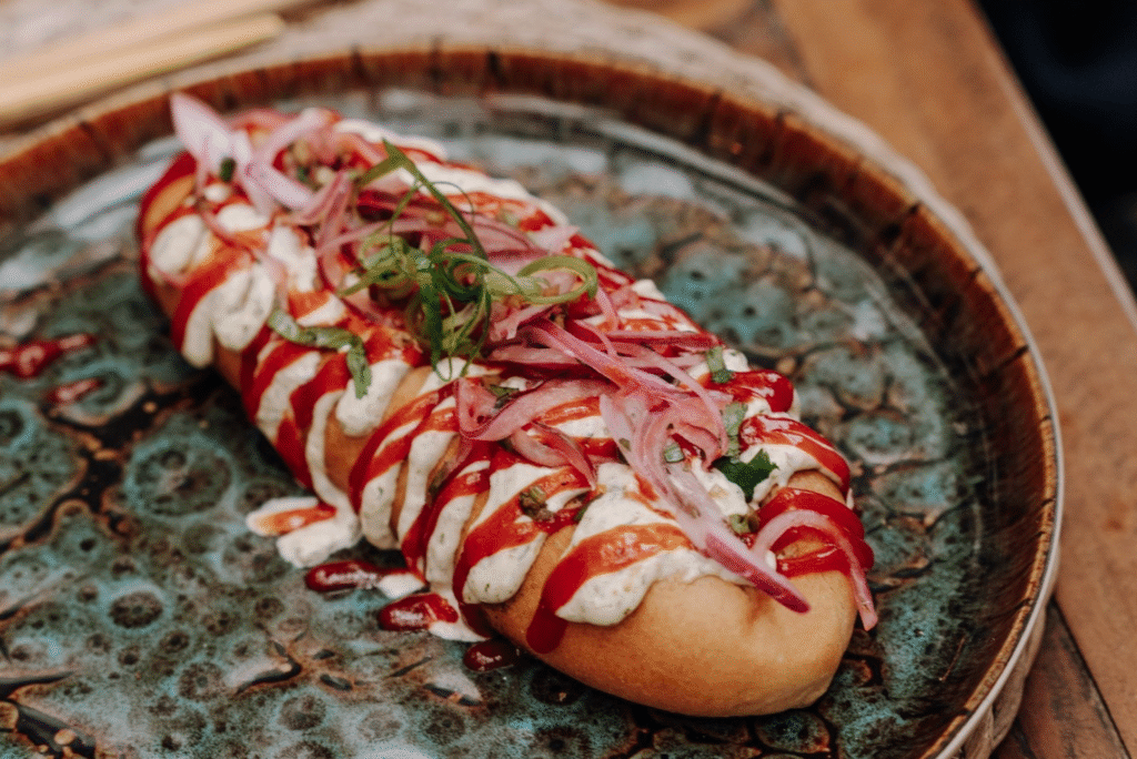 Joue de porc braisée, cheddar, pickles, oignons rouges et sauce ranch
