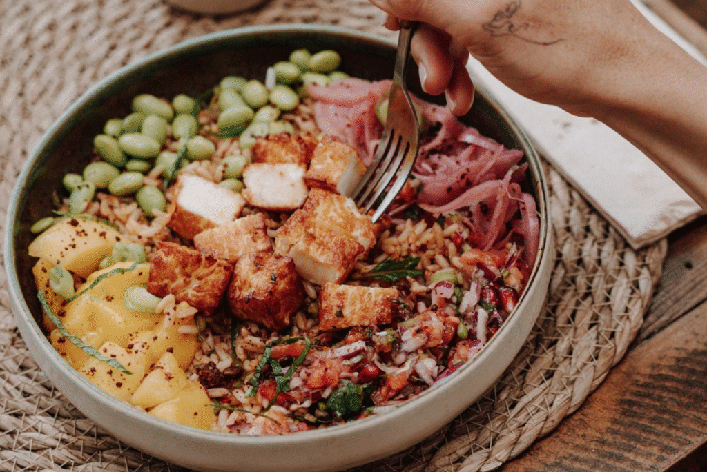 Riz, halloumi frit sauce hoisin, pickles, avocat, tomates marinées